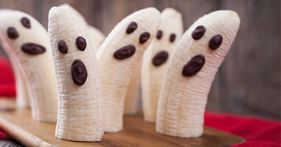 Bananas make great ghoulish ghosts. Raisins can be used to decorate their faces.