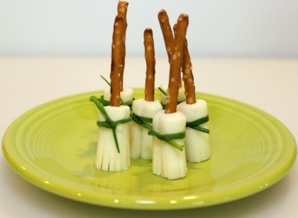 Wicked witches broomsticks can be made using pretzel or bread sticks, string cheese and a chive.