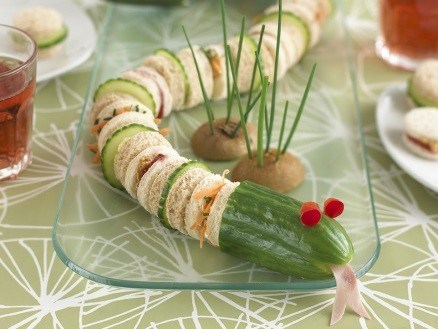 Small, round sandwiches filled with cheese, cucumber or ham can be displayed in the shape of a slithery snake with a cucumber head.
