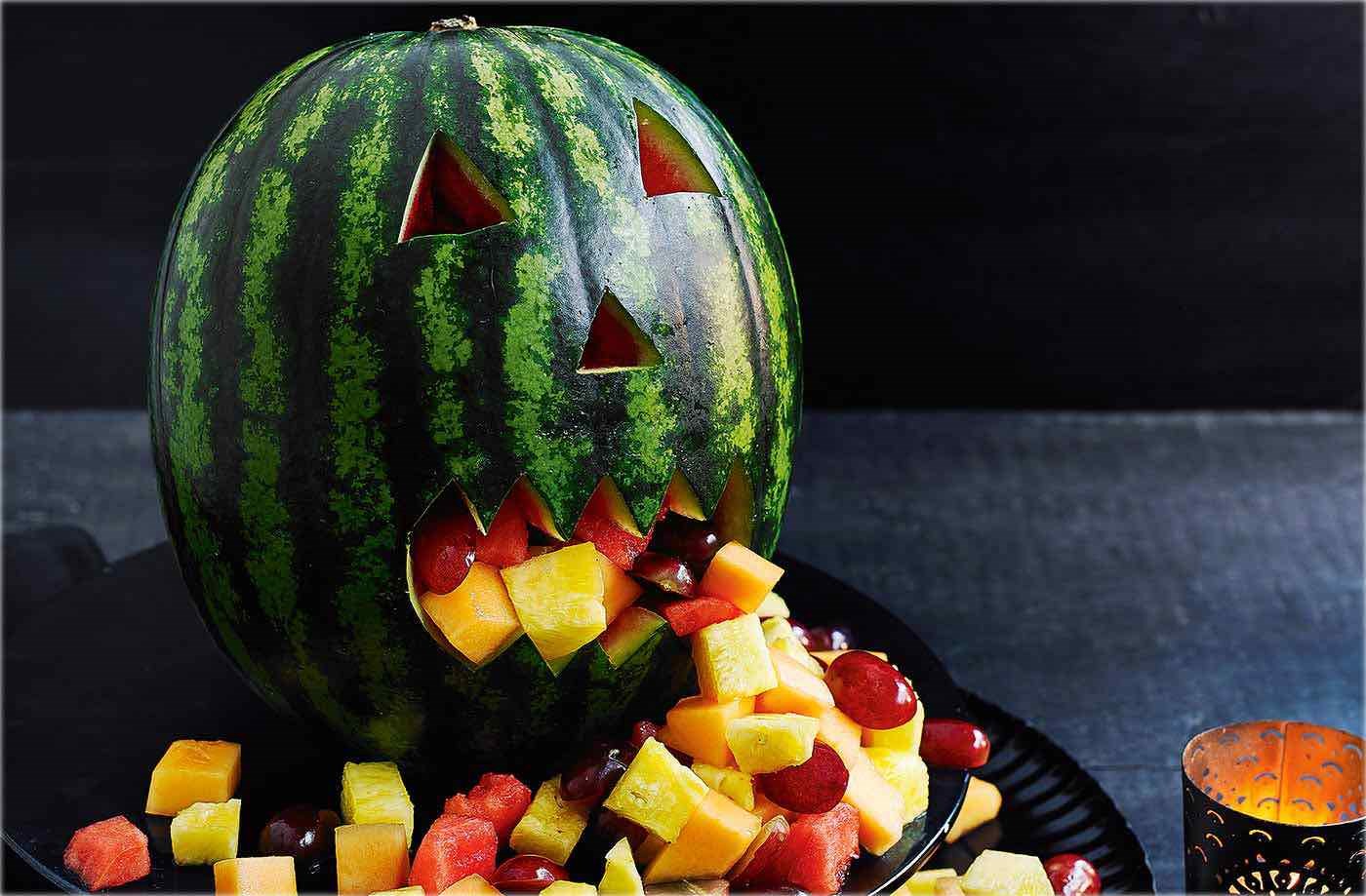 Water melons can be carved to make some fiendish faces to store some tasty melon chunks.